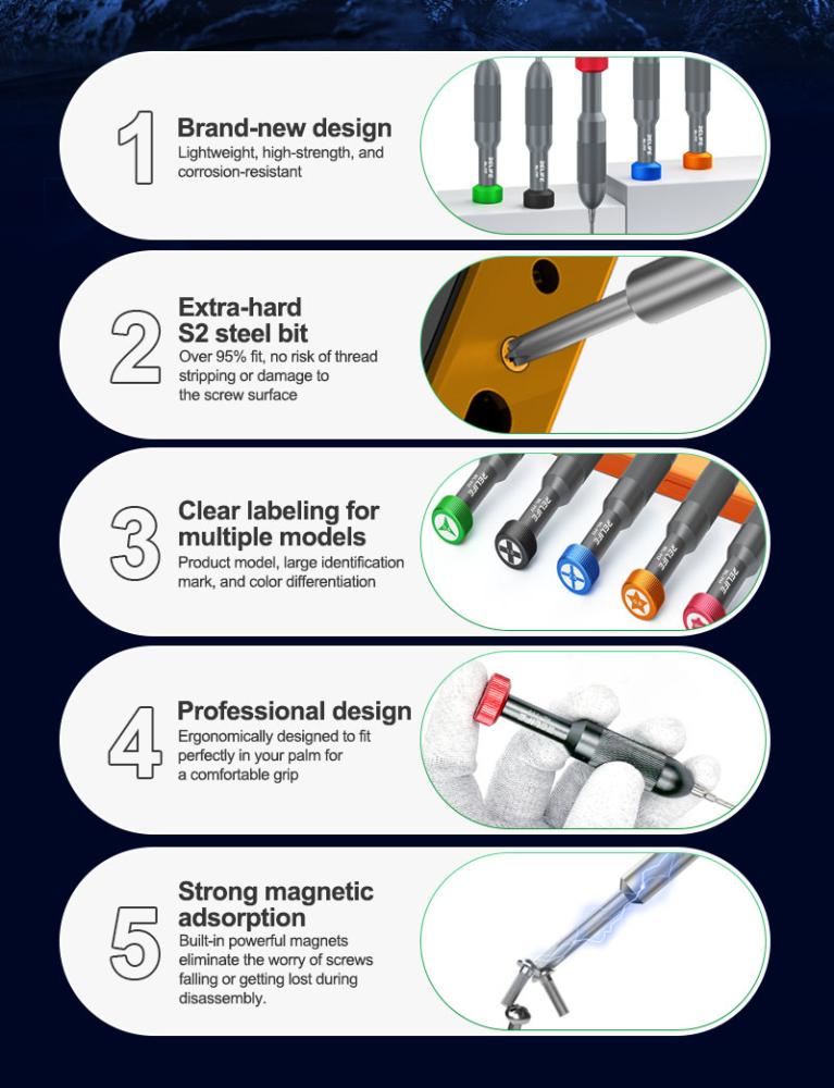 RELIFE RL-717A JUEGO DE DESTORNILLADOR DE PUNTA COHETE (0.8MM PENTALOBE / 1.5MM PHILLIPS / 0.6MM TRI-POINT / 2.5MM PINHEAD / IP17 TORX DESTORNILLADOR)