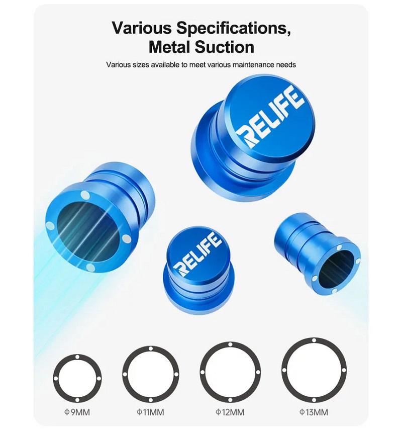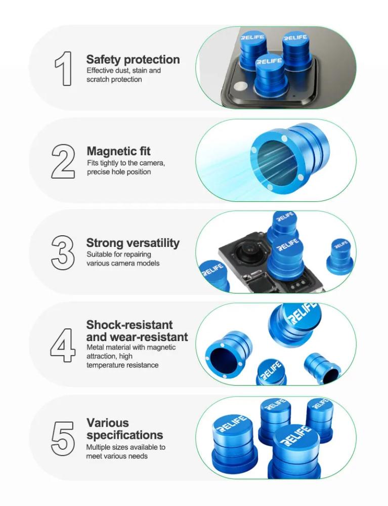 RELIFE RL-099 CUBIERTA PROTECTORA DE LUZ AZUL MAGNÉTICA PROTECCIÓN DE LENTE ANTIHUELLAS Y ANTIACEITE PARA REPARAR VARIOS MODELOS DE CÁMARAS (JUEGO DE 4 TAMAÑOS 13 / 12 / 11 / 9 MM)